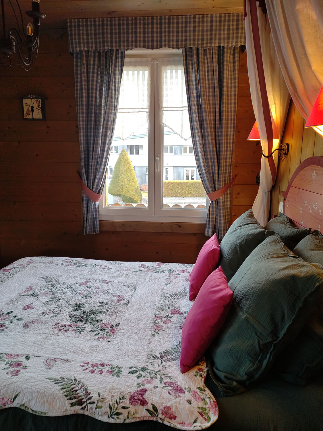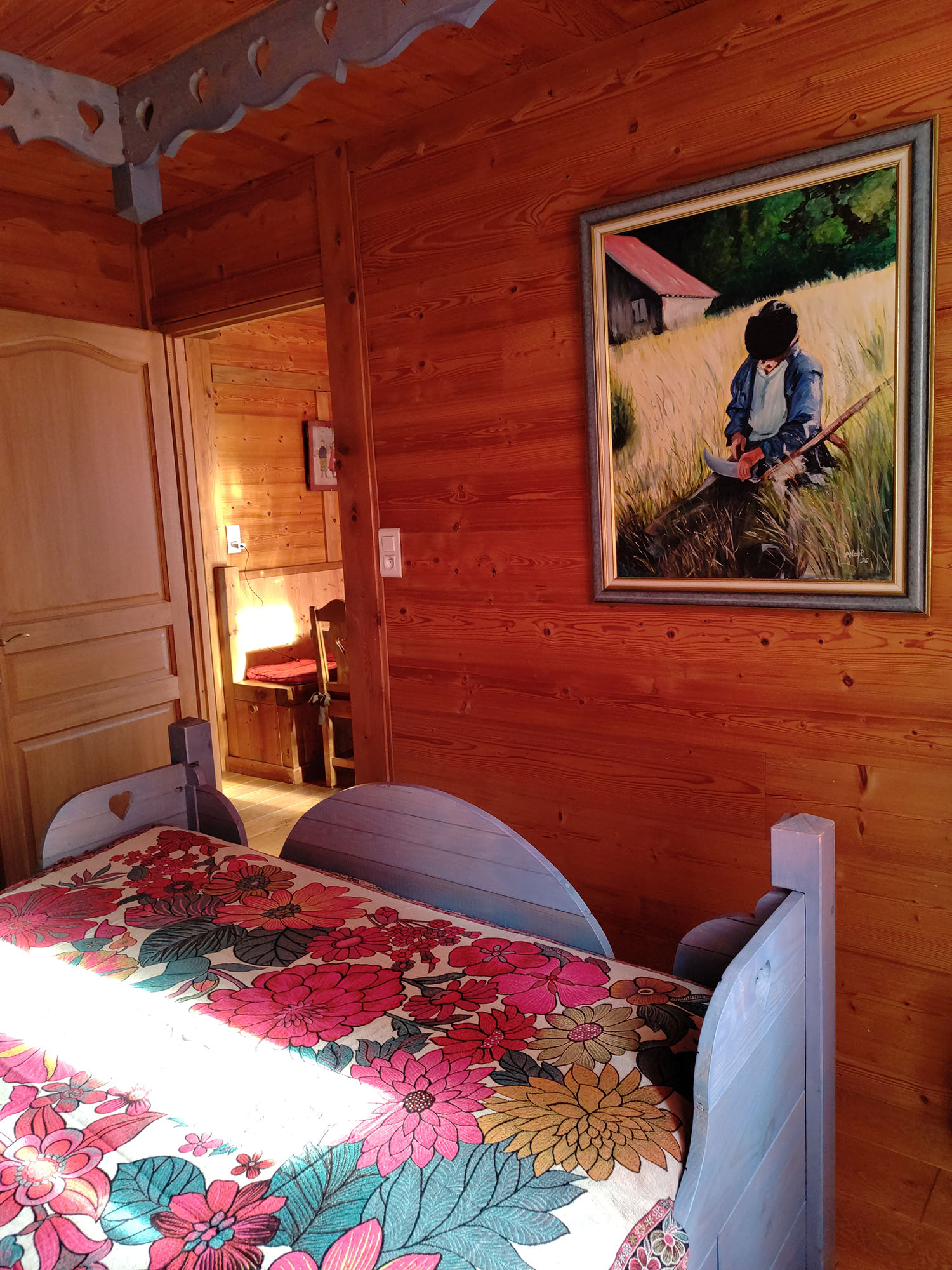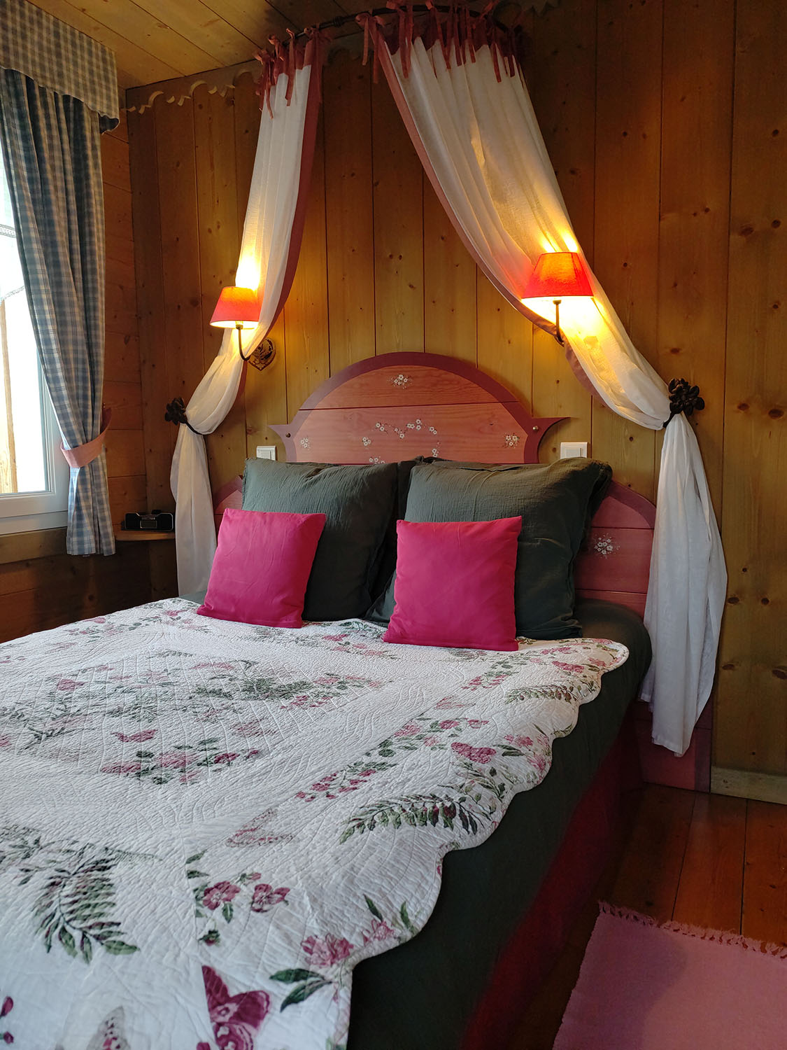 Colorful paints, four poster bed, warm colors, attention to details, cosy mood.